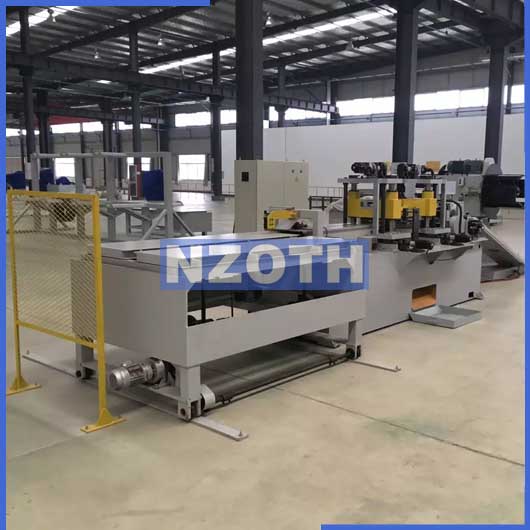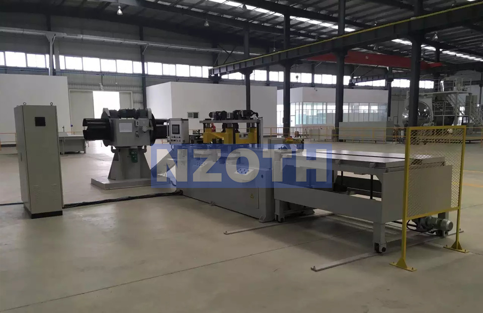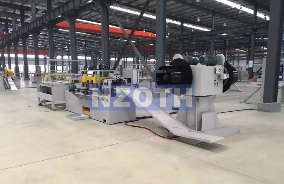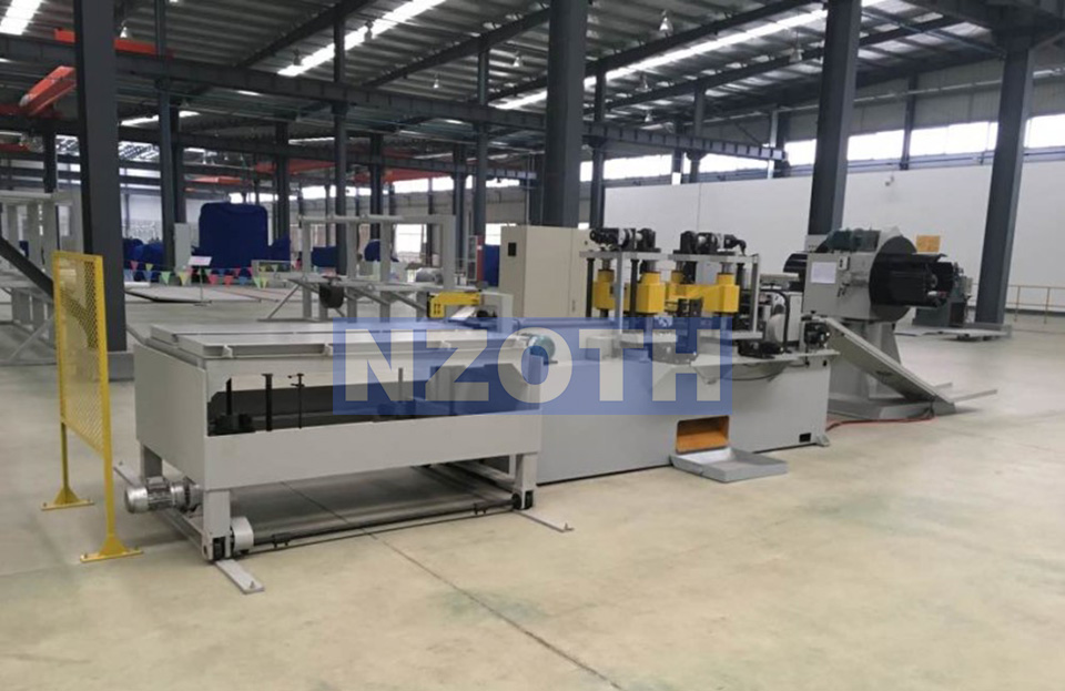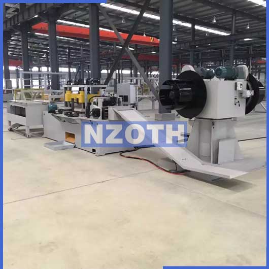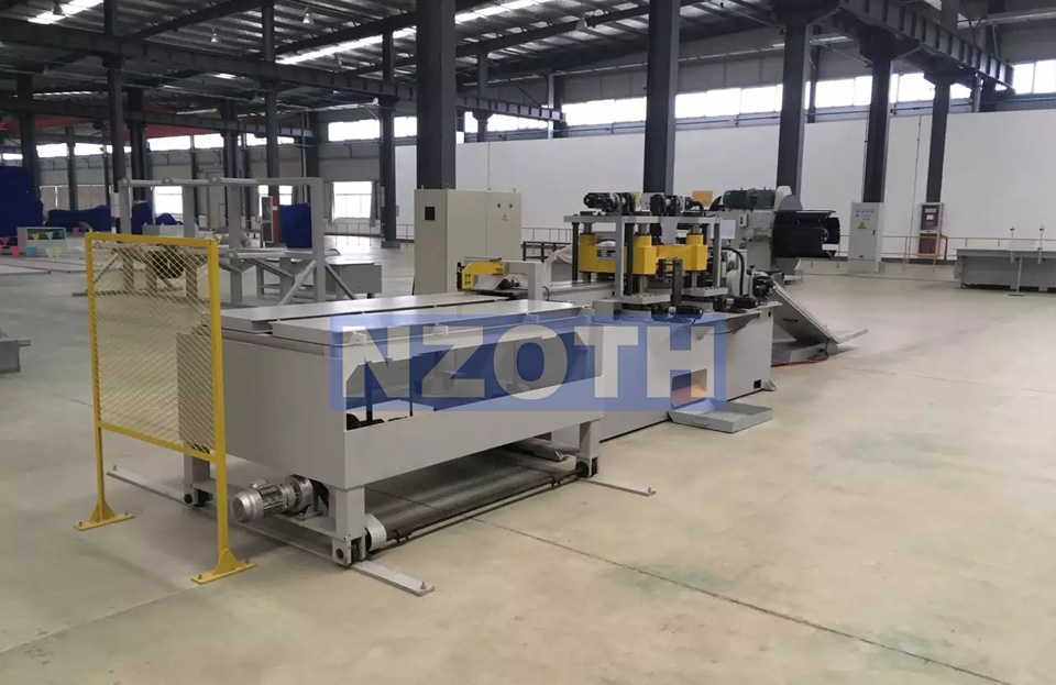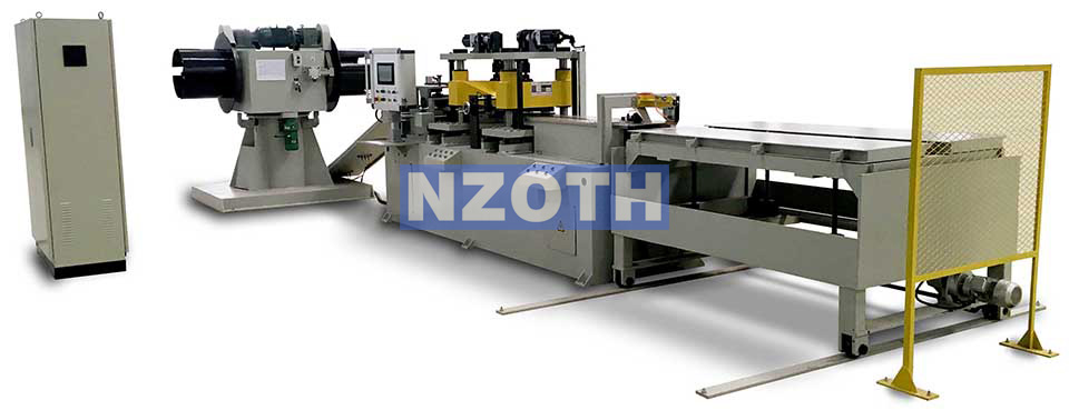 本設(shè)備由雙軸開料機(jī),編碼器,送料裝置,滾珠螺桿導(dǎo)向裝置,一臺沖孔機(jī),二臺V沖剪切裝置,料片傳送裝置,承料臺,電源系統(tǒng)等組成。